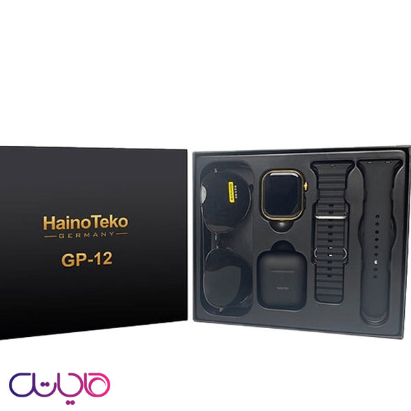 ساعت هوشمند هاینو تکو یه پک کامل ساعت و هندزفری و ساعت هوشمند می باشد. این پک شامل یک عدد عینک آفتابی ری بن، یک عدد هندزفری وایرلس، یک عدد ساعت هوشمند با بدنه طلایی و هچنین بند اضافه است.ساعت هوشمند داخل این پک،های کپی درجه یک اپلواچ سری 8 میباشد که دارای تمامی سنسوری های سلامتی،امکان دریافت اعلانات پیام ها و شبکه های اجتماعی،صفحه نمایش فول اسکرین2.2 اینچی،برنامه احتصاصی Haino fit و سایر امکانات میباشد.